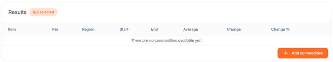 In the table 'Results', you can click on the orange button '+Add commodities' to make your own commodity selection and chart. After all the commodities have been chosen, you click on '+Add selection'.