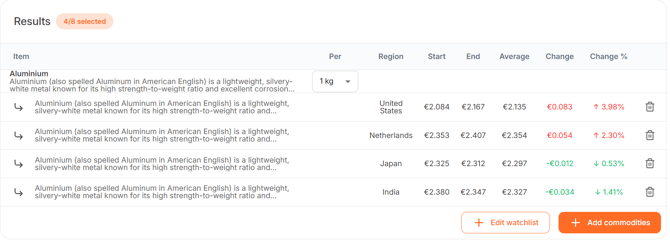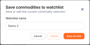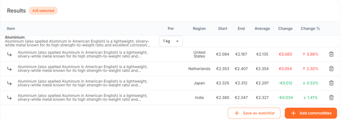 In the 'Results' table, you will see the chosen commodities and their price development. You are then able to click on '+Save as watchlist' and give it a name.