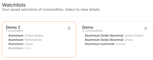 When a watchlist is created, you will find it at the top op the page under 'Watchlists'. Every time you would like to see those commodities again, the only thing you have to do is click on that particular watchlist and the table and graph will show.