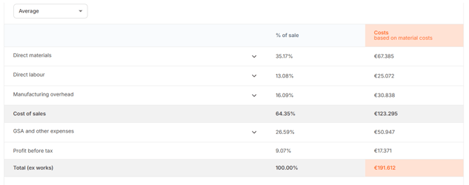 In the table, you can click open all cost drivers. These are the default cost drivers from any Industry Cost Profile, but the corresponding percentages are determined by the chosen industry, country and commodities.