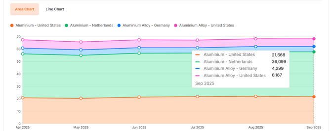 Click on 'Direct Material Chart' to review the total price over time of the commodities. You can choose between an Area chart or a Line chart.